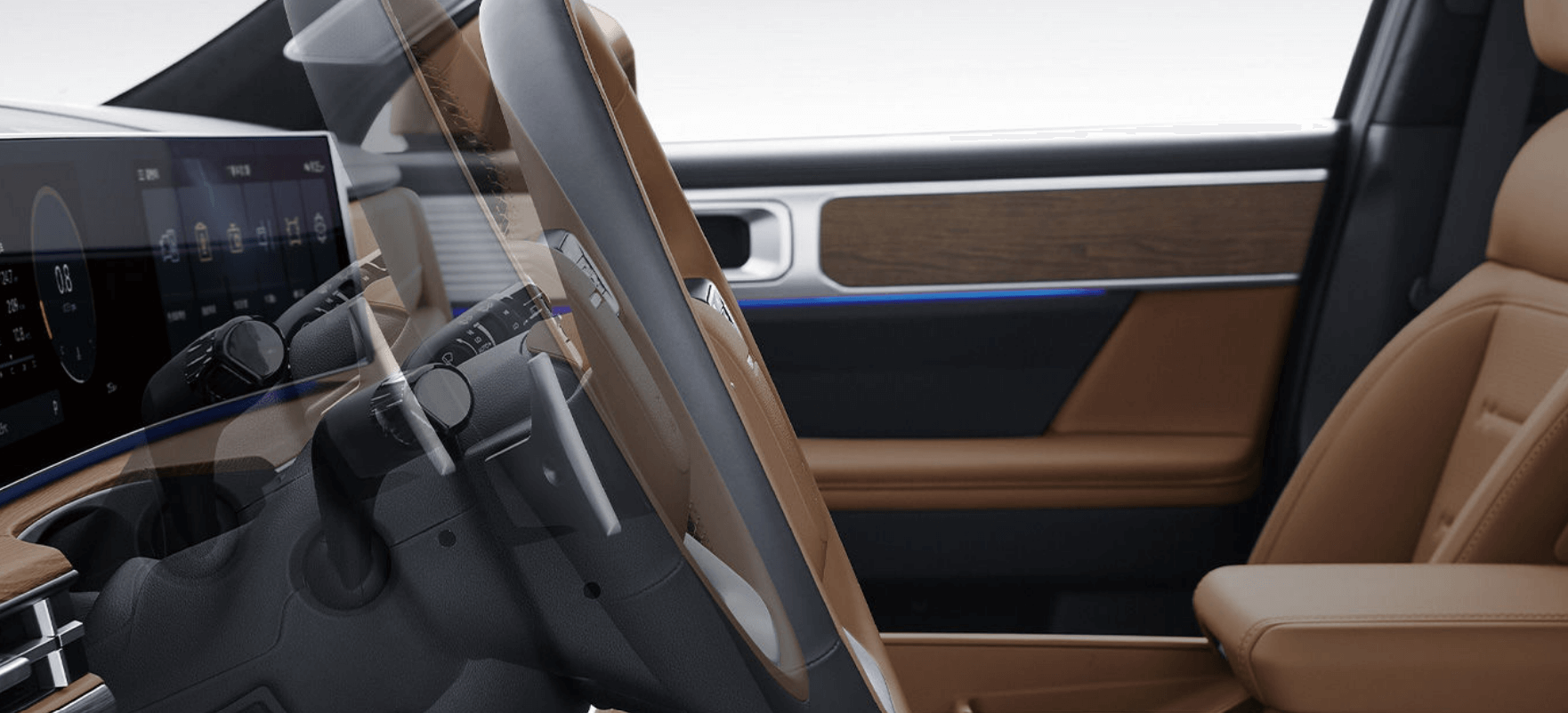 내장 인테리어로는 12.3인치 디지털 클러스터와 12.3인치 인포테인먼트 시스템이 구성된 디스플레이를 파노라믹 커브드 형태로 연결하여 고급감을 높였습니다. 전자식 변속 칼럼을 핸들에 부착하여 조작방식의 편안함과 공간을 넓게 활용할 수 있습니다.