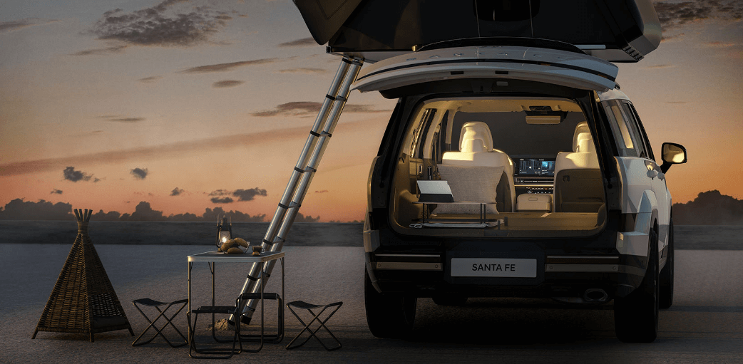 신형 싼타페의 큰 특징 중 하나로 꼽히고 있는 테라스 콘셉트의 와이드 테일게이트는 개방감을 활용하여 차박, 차크닉 등 다양한 아웃도어 활동에 적합합니다. 아웃도어에 적합하게 디자인된 싼타페는 5~7인승까지 다양하게 선택이 가능하며, 2열까지 완전 폴딩가능한 시트로 대용량 짐을 실거나 캠핑카로도 적합한 차량입니다.